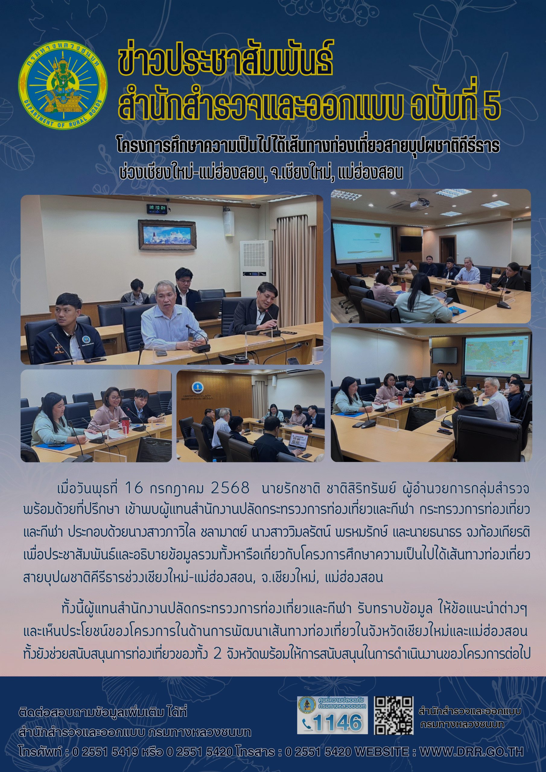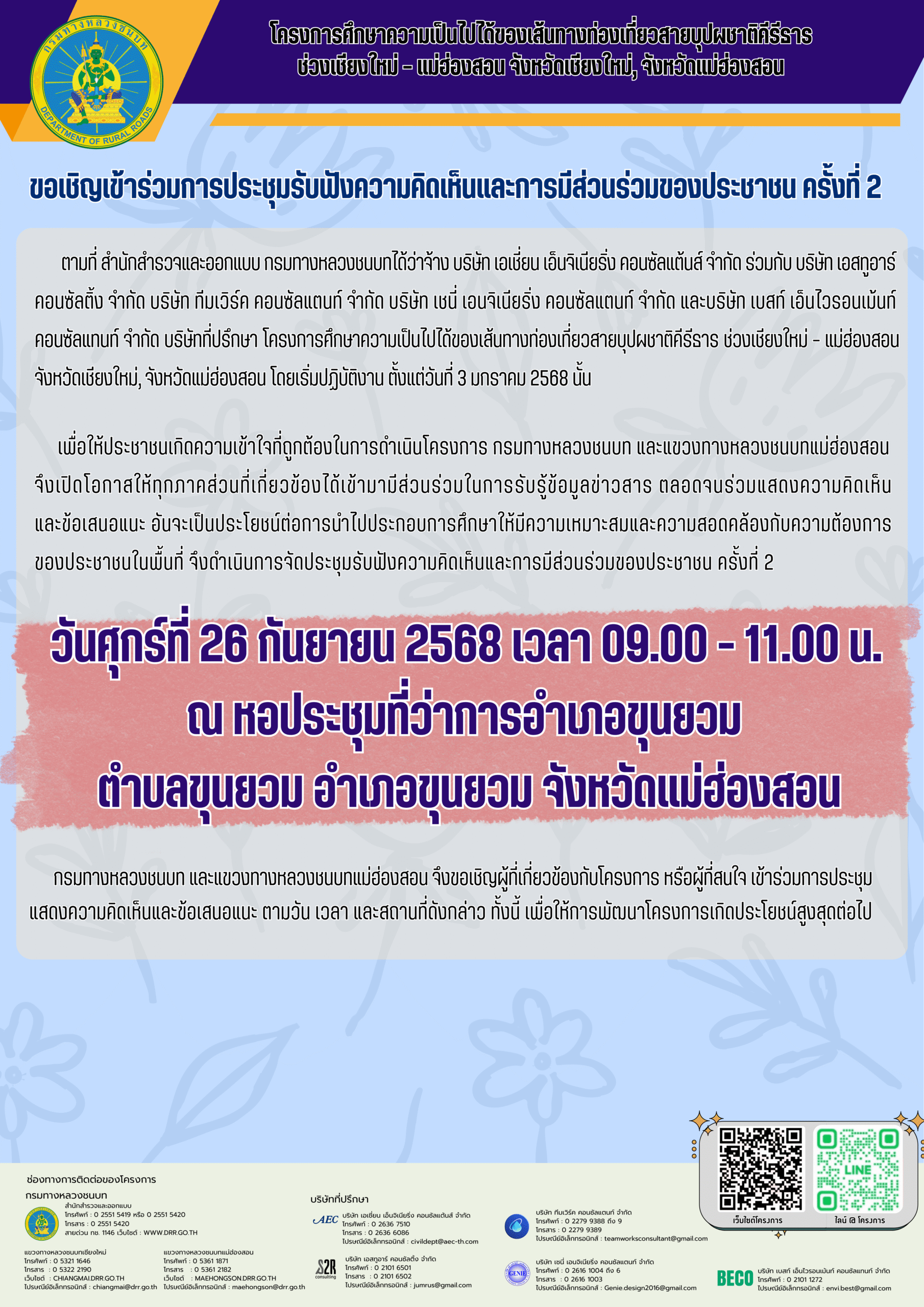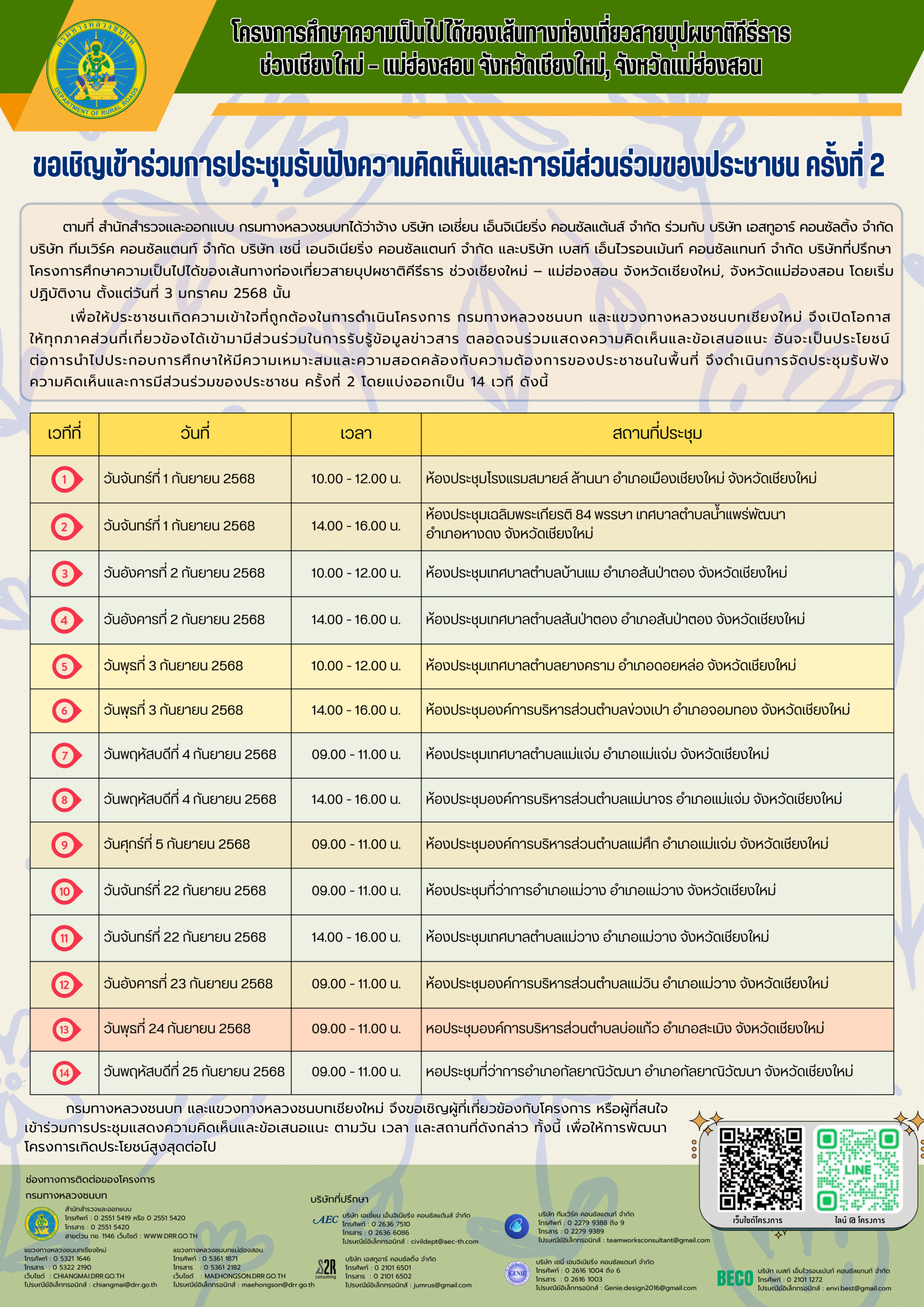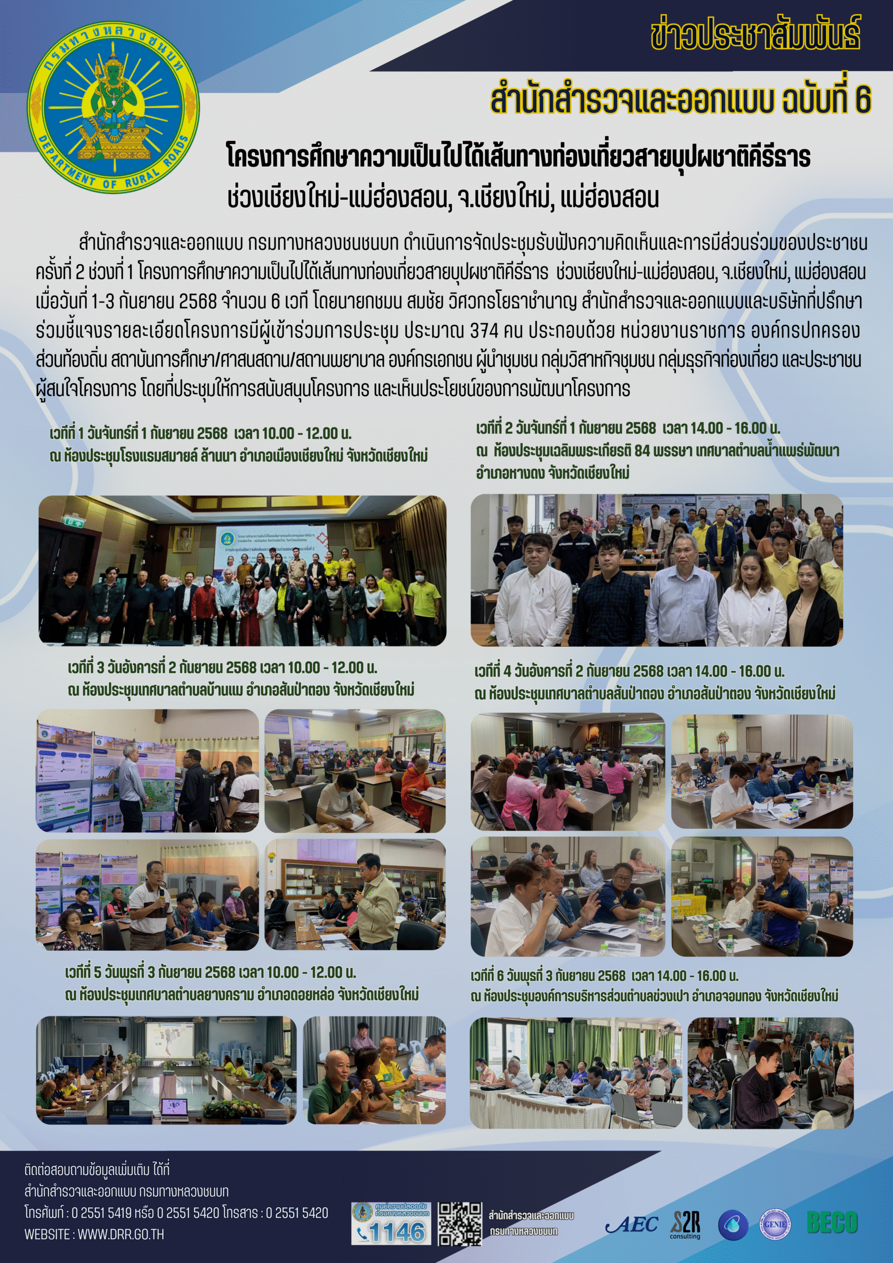 ข่าวประชาสัมพันธ์ ฉบับที่ 6 สำนักงานสำรวจและออกแบบ กรมทางหลวงชนบท ดำเนินการจัดประชุมรับฟังความคิดเห็นและการมีส่วนร่วมของประชาชน ครั้งที่ 2 โครงการศึกษาความเป็นไปได้เส้นทางท่องเที่ยวสายบุญฝ่าชาติศีรีธาร ช่วงเชียงใหม่–แม่ฮ่องสอน, จ.เชียงใหม่, แม่ฮ่องสอนเมื่อวันที่ 1–3 กันยายน 2568 จำนวน 6 เวที โดยนายกชมบ สมชัย วิศวกรโยธาชำนาญ สำนักงานสำรวจและออกแบบและบริษัทที่ปรึกษาร่วมชี้แจงรายละเอียดโครงการมีผู้เข้าร่วมการประชุม ประมาณ 374 คน