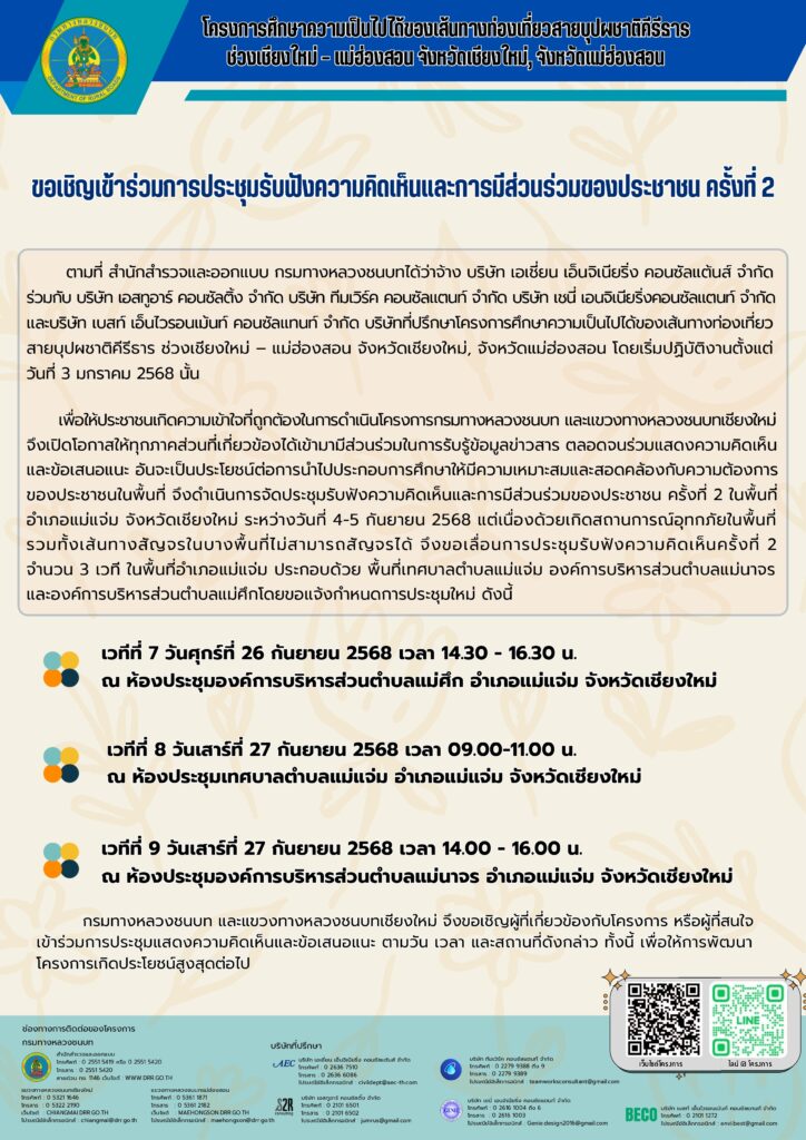 ข่าวประชาสัมพันธ์ ฉบับที่ 6 สำนักงานสำรวจและออกแบบ กรมทางหลวงชนบท ดำเนินการจัดประชุมรับฟังความคิดเห็นและการมีส่วนร่วมของประชาชน ครั้งที่ 2 โครงการศึกษาความเป็นไปได้เส้นทางท่องเที่ยวสายบุญฝ่าชาติศีรีธาร ช่วงเชียงใหม่–แม่ฮ่องสอน, จ.เชียงใหม่, แม่ฮ่องสอนเมื่อวันที่ 1–3 กันยายน 2568 จำนวน 6 เวที โดยนายกชมบ สมชัย วิศวกรโยธาชำนาญ สำนักงานสำรวจและออกแบบและบริษัทที่ปรึกษาร่วมชี้แจงรายละเอียดโครงการมีผู้เข้าร่วมการประชุม ประมาณ 374 คน